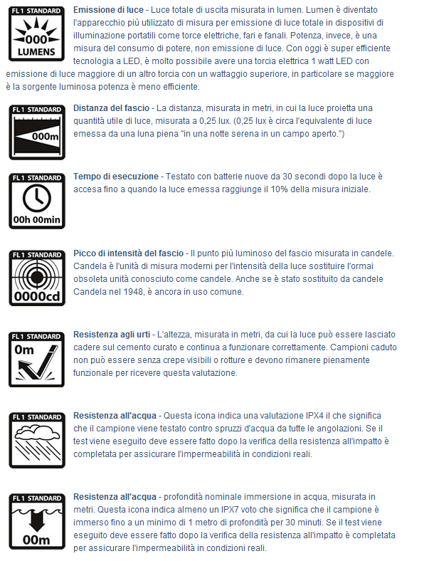 Sotto un esempio di una tabella con valori ANSI/NEMA FL1 riferiti ad una torcia tattica, come si vede i simboli sono facili ed intuitivi.