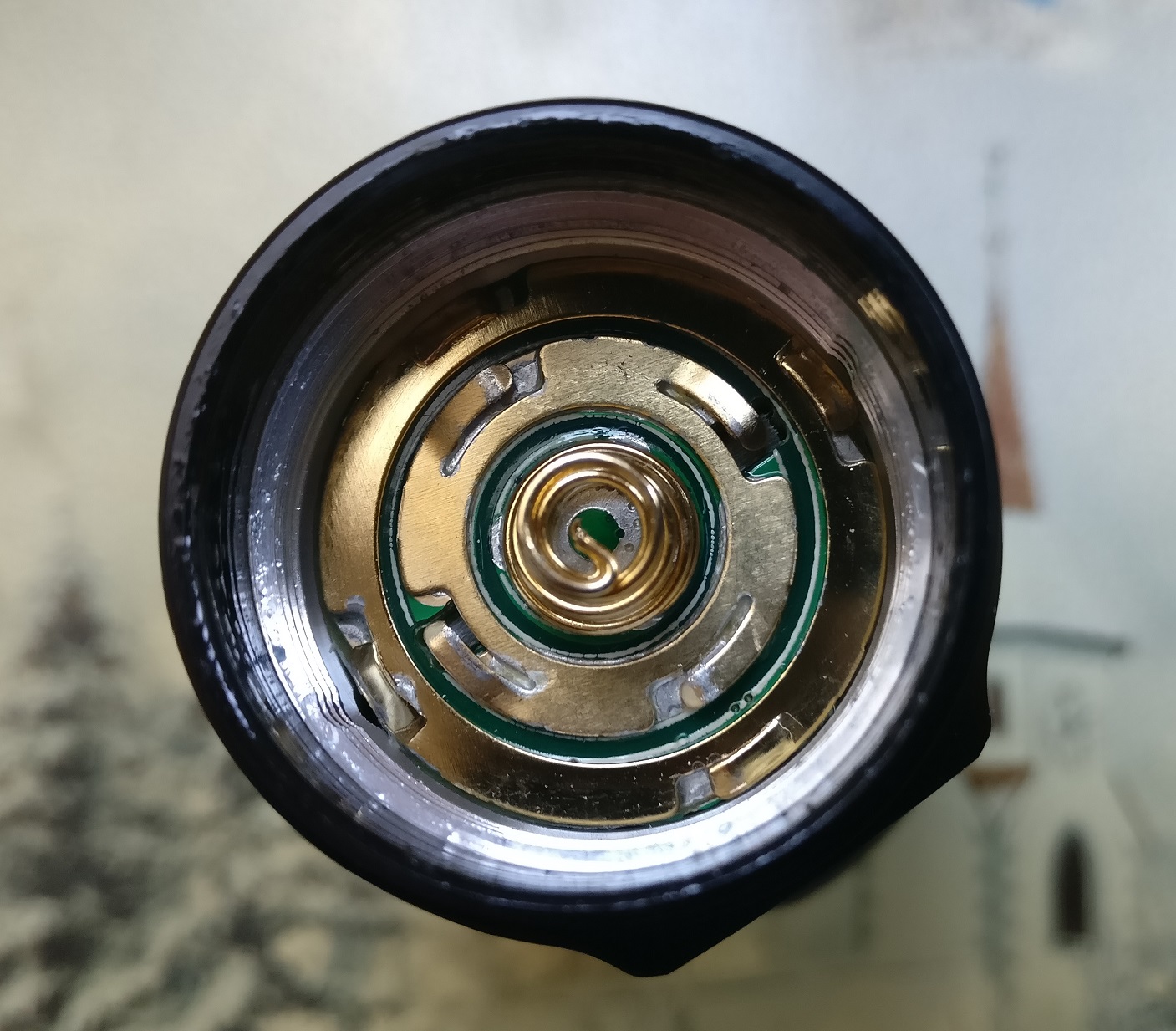 Ho scritto quanto sopra, perché ho notato che le filettature della torcia sono "bene" ingrassate, forse e ripeto forse anche troppo, inoltre è molto importante che i due pulsanti posteriori siano messi in grado di comunicare con il driver posto nella testa della torcia, questo avviene attraverso i 4 punti di contatto striscianti a pressione che cirondano la molla del positivo, vedi foto sotto.