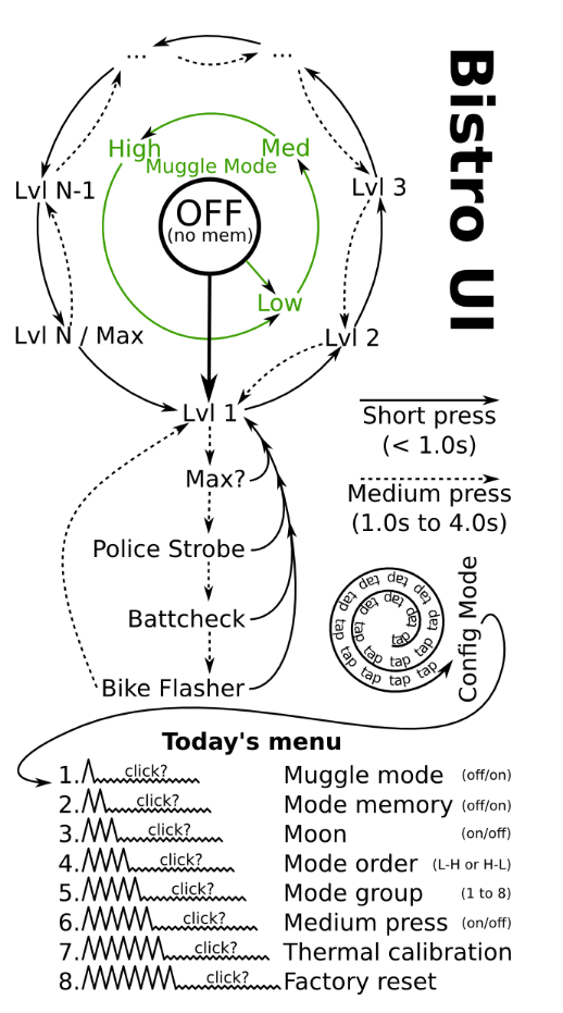 Ho acquistato da Banggood una Astrolux S2 (BLF) ma appena l'accendo mi trovo davanti a una gran confusione. Tutto è mescolato, livelli di luce, strobo e company, e soprattutto il modo disordinato in cui si susseguono l'un l'altro. Per capire la complessità di questo driver basta guardare lo schema allegato (vedi foto). io vorrei una semplicissima modalità composta da 5 livelli di luce ma pur essendo disponibile non riesco a impostarla. Se qualcuno mi dà una mano gli sarò grato per l'eternità!