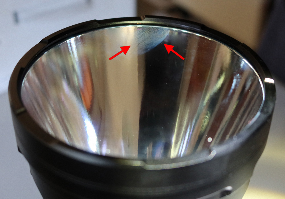 L'impronta era stata lasciata inavvertitamente dal sottoscritto che aveva svitato il bezel ed estratto la parabola per riposizionare correttamente il tondino di plastica con un foro al centro da dove appare il LED. Il tondino era giunto decentrato e faceva apparire decentrato il LED, che invece era al posto giusto. Il problema, assai semplice, è stato risolto con facilità ma nel riposizionare la parabola ne ho sfiorato il bordo con un dito ed è rimasta l'impronta. Il panno morbido ha rimosso l'impronta ma ha lasciato una leggera striatura visibile nella foto allegata.