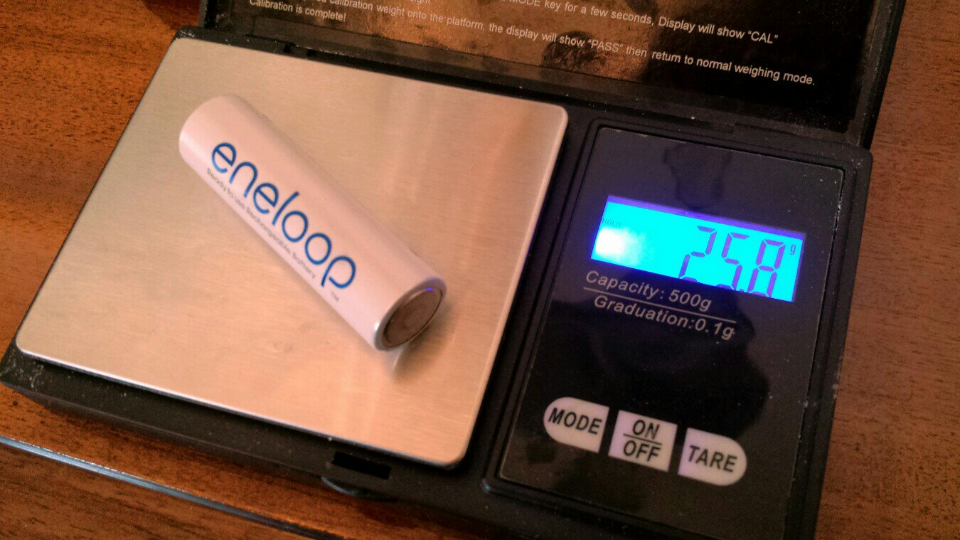 Ho pesato una Eneloop da 2000 mAh, peso 25,8 grammi. Non ne possiedo di nere.