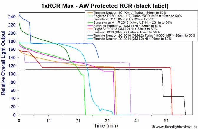 Se per massima luminosità intendi il turbo, le RCR 16340 non ce la fanno, immagino perché con quell'output siano necessari almeno 3A, corrente fuori dalla loro portata. Riescono ancora a gestire discretamente il livello alto, quello da 600 lm, per gran parte del tempo comportandosi come le 18650. Grafico preso dalla review di selfbuilt: