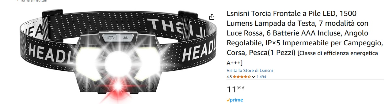 Poi, in sostituzione, o in aggiunta, una frontale che usa 3 batterie AAA, sempre su Amazon