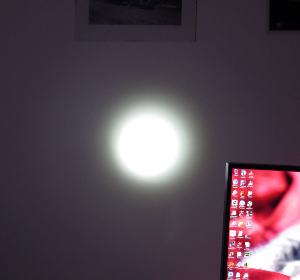 Nell'immagine successiva la torcia è perfettamente perpendicolare al muro, ed in effetti il cerchio dello spot non presenta imperfezioni. Quello che non va è quell'alone irregolare che c'è intorno.