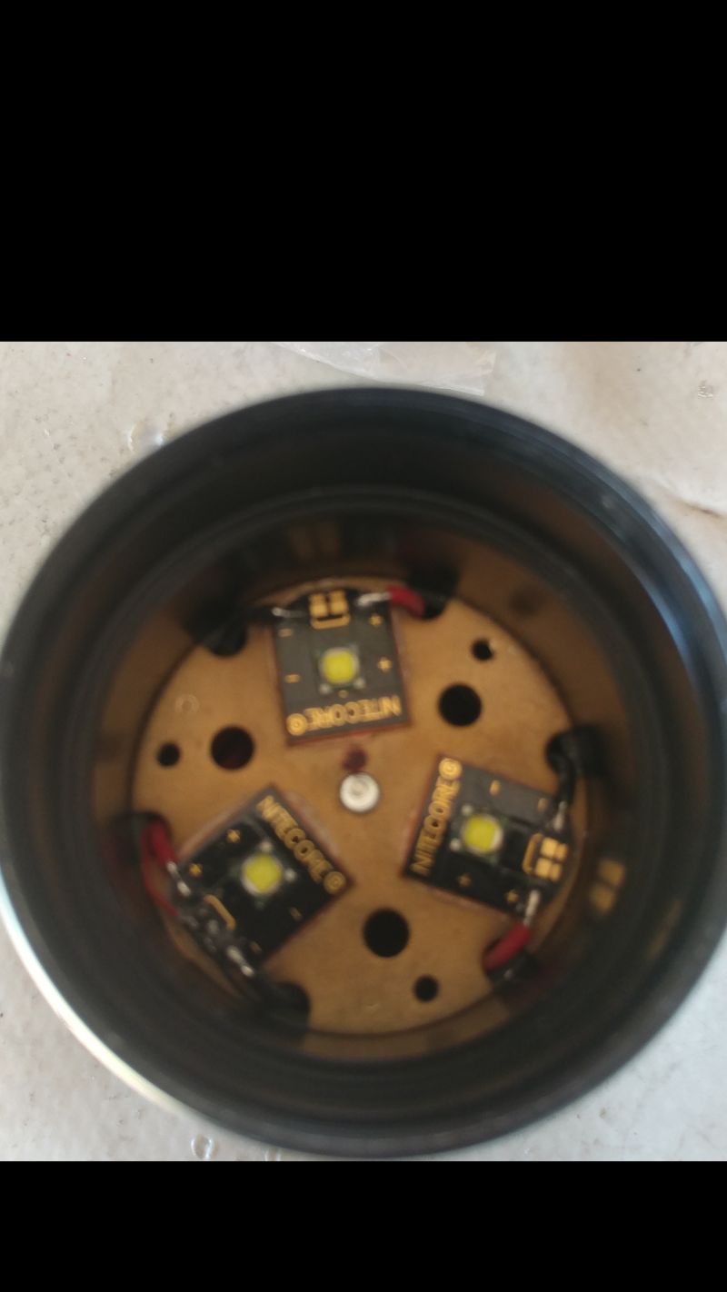 giorni fà la mia "Piccola" Nitecore TM15 mi è caduta in terra ed uno dei led si è spento. La parte ghiera,vetro e parabola si smonta facilmente. Sono così arrivato ai led e con un generatore a corrente costante , preventivamente staccando i fili di arrivo , ho fatto accendere il led che sembrava morto. Il problema potrebbe essere sul driver. Il problema è che non so come rimuoverlo dal corpo torcia. Qualche idea? Grazie
