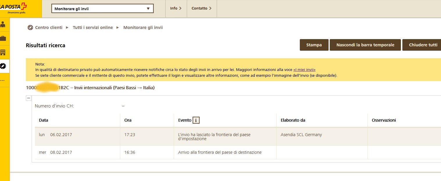 La spedizione, non avviene mediante poste olandesi e successivamente poste italiane?