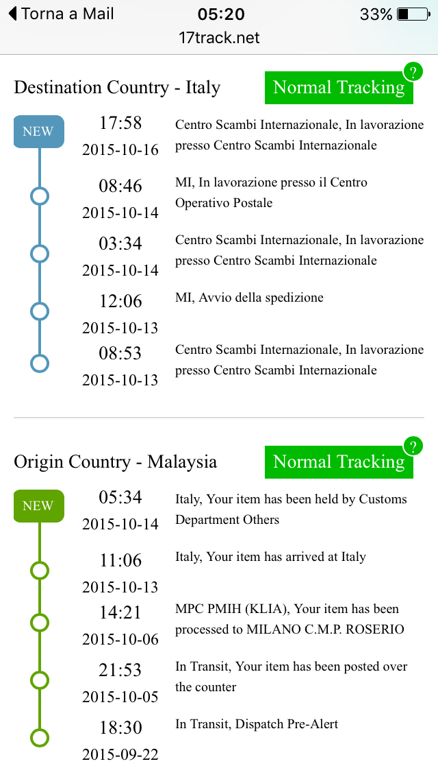 Anche a me tutte e 2 le spedizioni in corso dalla Cina stanno facendo quella trafila. Uno dei due (Malesia) dopo il secondo passaggio al centro scambi internazionale si è materializzato direttamente all'ufficio postale del capoluogo di provincia, senza passare per le altre grandi città che mi dividono da Milano come succede sempre.... dell'altro so solo che è ancora fermo al centro scambi..