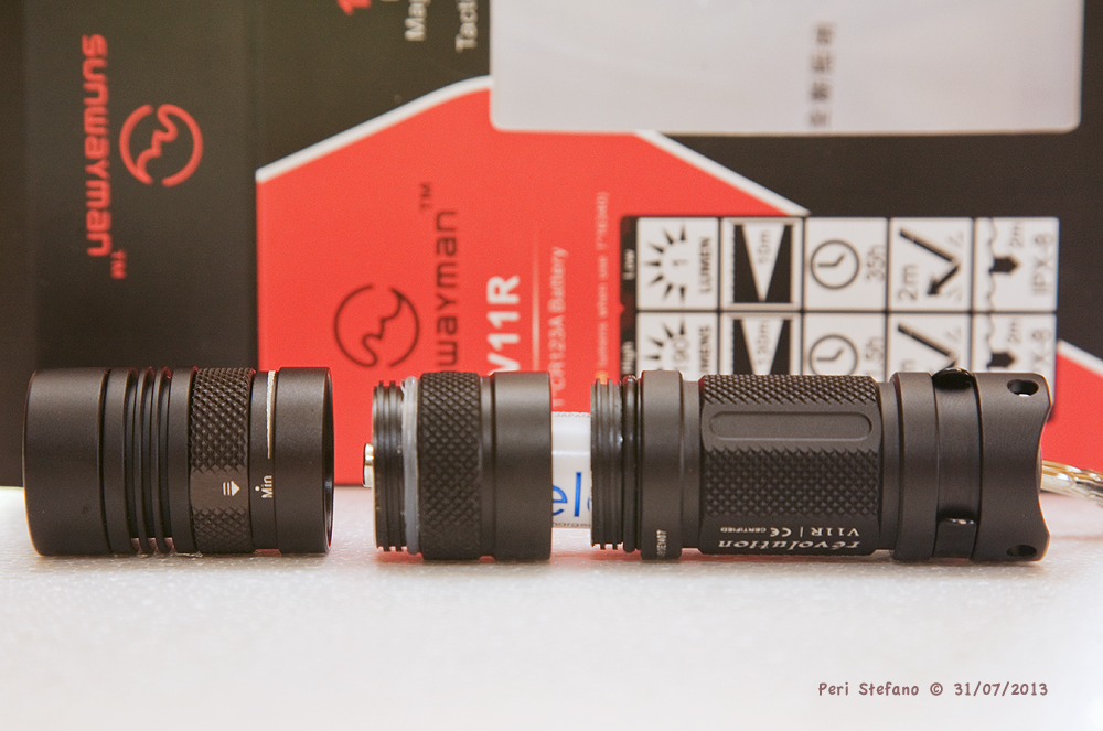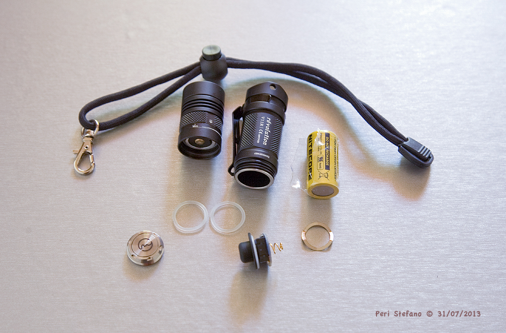 il contenuto della confezione della torcia in particolare : il tasto di ricambio con la copertura metallica, gli o-ring e il laccetto che devo dire è ottimo, avevo letto che i laccetti di fenix sono un po scarsi, in effetti al confronto di questo c'è poco da replicare.