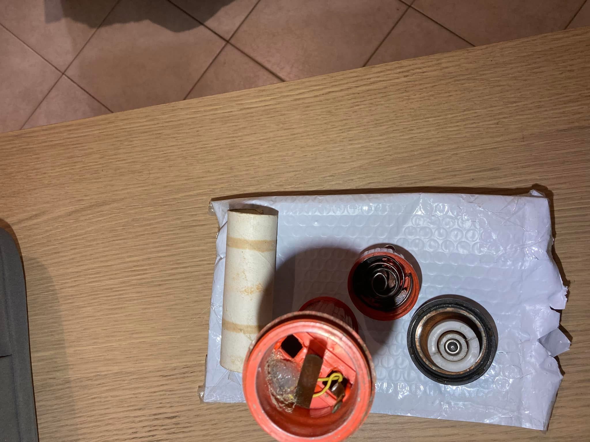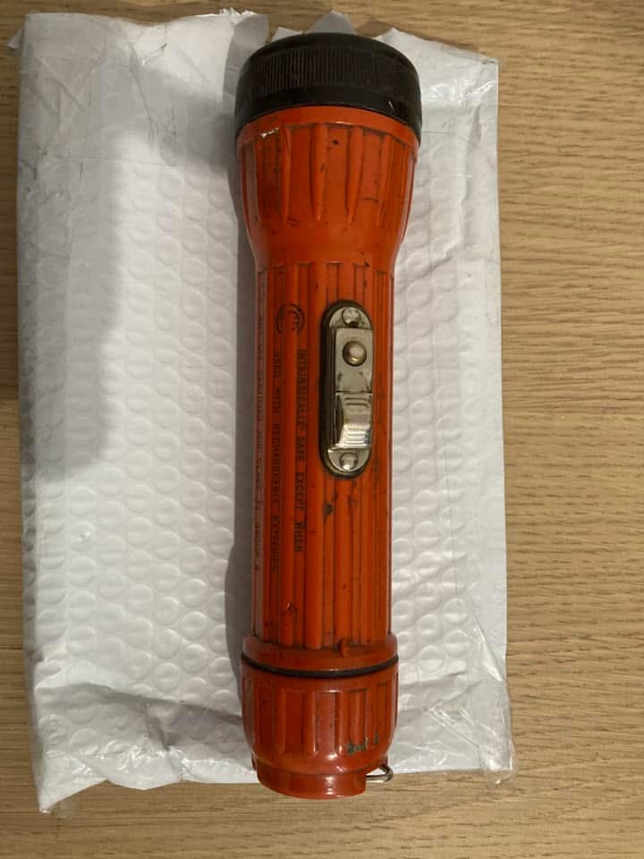 Torcia industriale usata su piattaforme o raffinerie Gulf di sicurezza per ambienti infiammabili con dispositivo antirottura bulbo e modificata artigianalmente per usare le batterie D ricaricabili, devo ancora pulirla e verificarne il funzionamento, dal tipo di interruttore risale agli anni 60/70 al massimo, il tube del rotolo di carta igienica 🧻 serve a fare più spessore per rendere le batterie D più stabili.