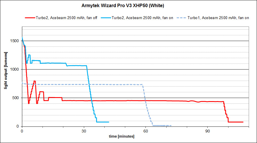 Con celle scariche 3,15 V a riposo, la torcia dispone di tutti i livelli ma limitati nell'output stante l'assorbimento massimo di 2,8 A.