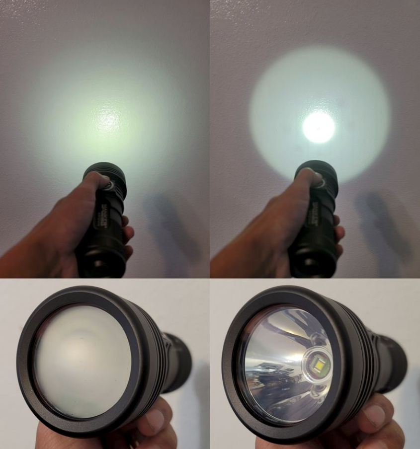 Non mi sono accorto del rumore, né so da cosa possa essere prodotto visto che non ci sono parti meccaniche o motorini elettrici in gioco. In realtà la novità rappresentata da questa torcia è relativa perché dei cosiddetti "smart glass" o vetri a opacità variabile si parla da tempo. Mentre nell'applicazione su finestre di abitazioni e uffici la funzione principale è il passaggio della luce variabile a comando (niente più tapparelle) e il fatto che il vetro diventi un diffusore flood è un "effetto collaterale", nella Manker accade esattamente il contrario. Il vetro aumentando la sua opacità funge da diffusore flood ma il calo di luce? Temo che con il vetro opacizzato i 5000 Lm della Manker come minimo si dimezzino, il ché significa dover usare una torcia voluminosa (3x18650) e che si scalda parecchio per avere la luce flood di una EDC. Questo timore sembra confermato dalle foto scattate da SkyLumen (vedi sotto) dove la parte flood del fascio di luce è più intensa nella posizione throw che in quella flood.