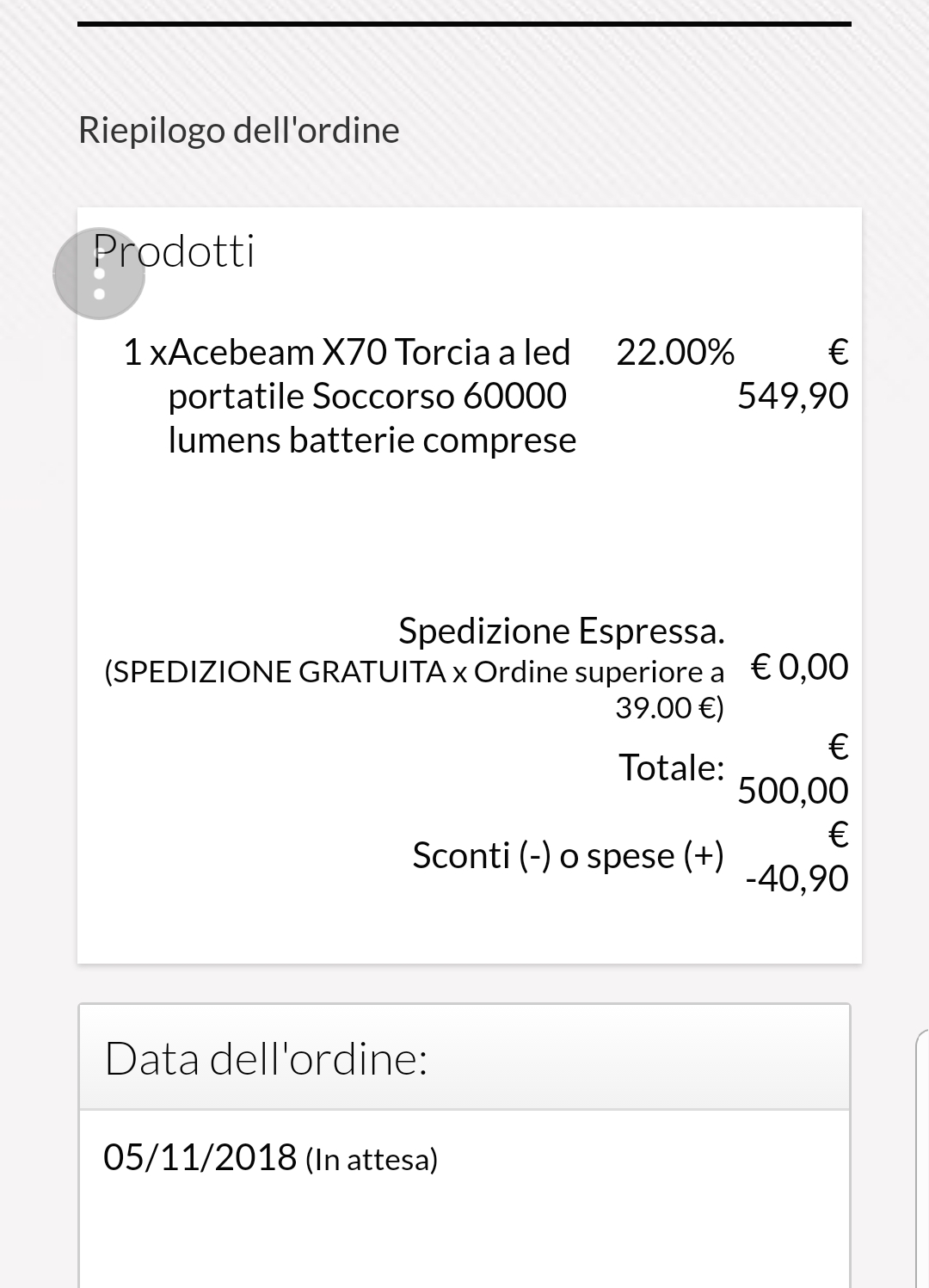 Questa la schermata che ti appare se è tutto ok in attesa che arrivi il bonifico. Una volta arrivato spediscono e di li ci vorranno 48 ore più o meno (tra l'altro hanno sbagliato a scrivere sconto di 40.90 anziché di 49.90 ma alla fine come vedi il totale è 500 comunque)Massimo Moretti ha scritto: ↑05/11/2018, 21:35Complimenti........ora tocca a me.......per oggi ho desistito.......chissà domani.......ma una cortesia ma durante l’ordine hai dovuto inserire il codice coupon per lo sconto.....o telefonicamente hai seguito un’altra procedura........![]()