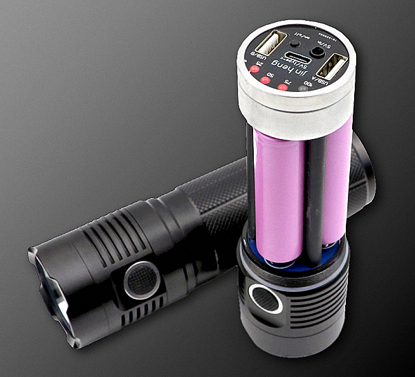 1 x Cree XHP-70.2 - 3600Lm - CW - riflettore OP - Funziona con 3 batterie 18650 non protette - Funge anche da power bank con 2 uscite USB - Si carica tramite una porta USB-C o micro-spinotto oppure estraendo le batterie e caricandole a parte.