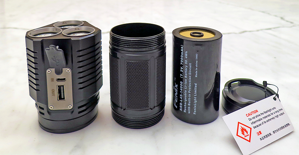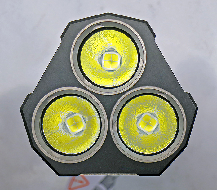3 Cree XHP70 LED • 9000 Lumen • 20.500cd • Range 286m • Pacco batterie 7.2V/7000mAh • Carica via USB • Ha anche un'uscita per caricare telefonini, ecc.