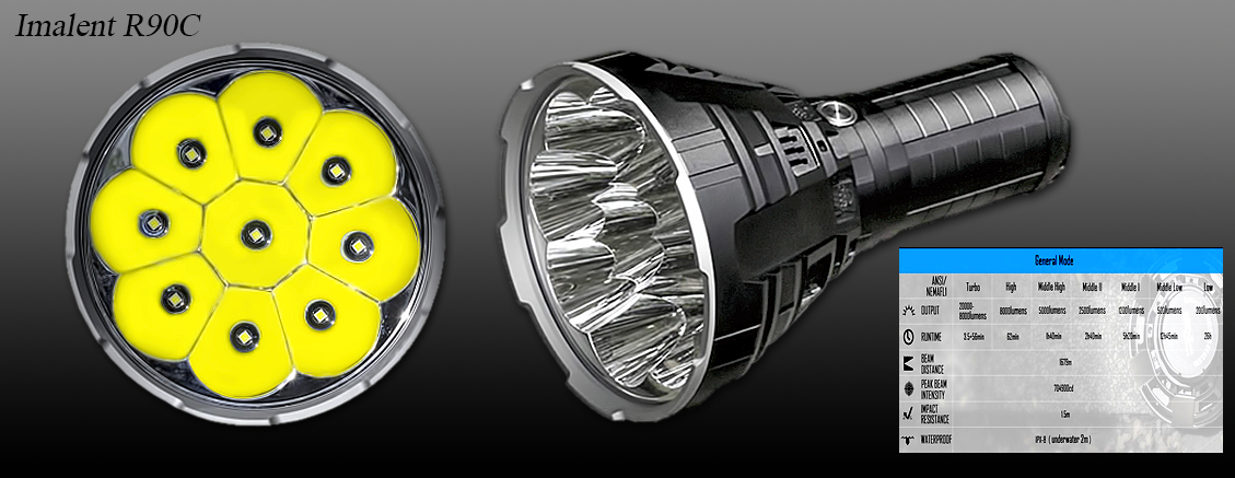 Due parole su questa torcia. Premesso che la Imalent non è affatto il mio produttore preferito ma è quello che spara le balle più grosse circa l'output delle sue torce (ad esempio quella in oggetto ha realmente "soli" 15.000Lm), devo però dire che a mio parere il fascio di luce emesso dalla R90C è il più bello che abbia mai riscontrato. Arriva a grande distanza ma con un hotspot assai grande e sfumato immerso in un'ampio spill, dunque nulla a che vedere con lo spottino circolare troppo netto anche se più luminoso delle torce da tiro che arrivano a 2,5Km (in teoria). Il fascio luminoso della RC90 - dato per 1680m - arriva tranquillamente a mezzo chilometro ma illuminando un'area ampia che consente all'occhio di riconoscere immediatamente cosa sta vedendo. Inoltre la tinta è un bianco perfetto, senza sfumature di blu o di giallo. Il prezzo da pagare per queste prestazioni è l'alto output che in turbo prosciuga rapidamente le batterie (56 minuti), ma su Aliexpress è disponibile un secondo pacco batterie identico a quello che viene con la torcia a circa 90 euro. Tuttavia la torcia ha un tiro notevole anche ai livelli di luce più bassi quindi il turbo serve soltanto per casi eccezionali. Purtroppo la combinazione di una grande intensità luminosa e di un hotspot largo e sfumato pare irraggiungibile per le più economiche (non tanto) torce monoled con grosso riflettore.