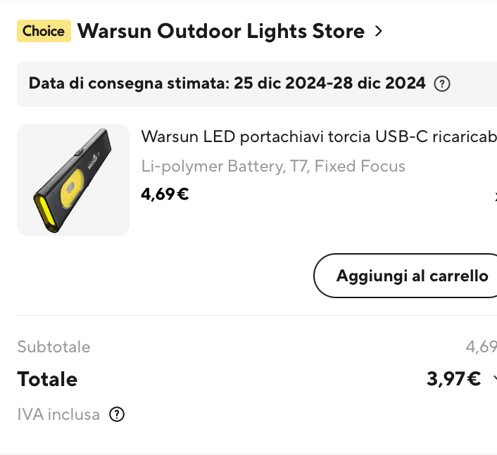 Le torce cinesi non blasonate (Olight, Nitecore) come Wuben, Warsun e Buruit le prendo su Ali per il costo nettamente inferiore e ormai hanno una consegna breve, una decina di giorni non di più, ovviamente l’eventuale reso si va a fare benedire e al momento non ho avuto sorprese negative.